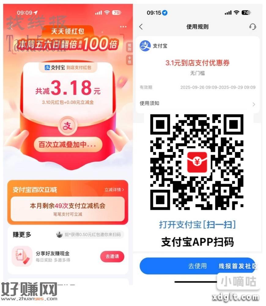 支付宝APP扫码,今天大概率领2~10亓左右消费红包