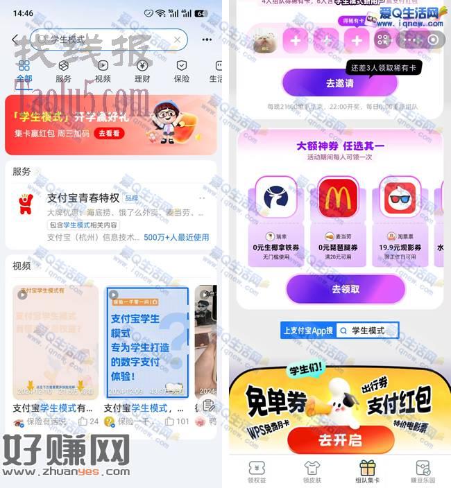 支付宝app搜【学生模式】点进去 下拉只【大额神券】可以领取0元生椰拿铁