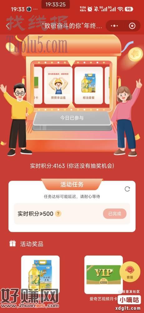 #小程序://深i工/DDh5nZvZHPz3sFu 100积分1次 一天3次 粮油或者爱奇艺,中奖几率不高