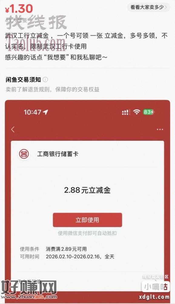 有武汉工行卡的去,1.3 买 2.88 立减金,一二三类卡都可以,闲鱼搜武汉工行立减金,多号多领,1.58 润一个号