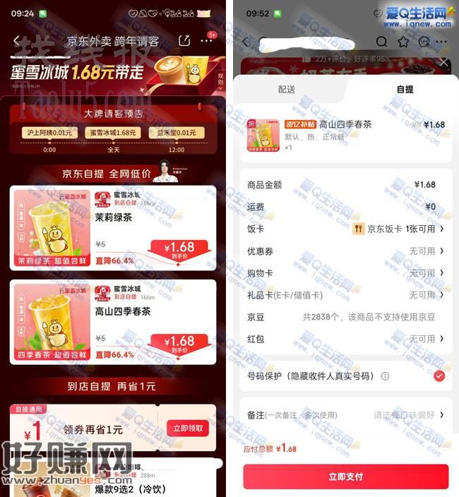 需要自提的哦,想喝蜜雪的可以领取哦,还是不错的直接1.68元一杯