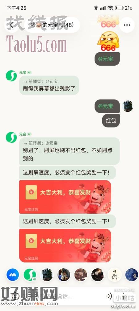 元宝派里面可以用连点器刷屏表情包,然后艾特元宝可以刷出红包,