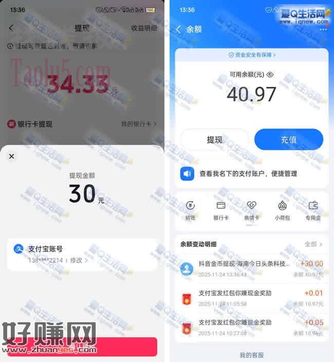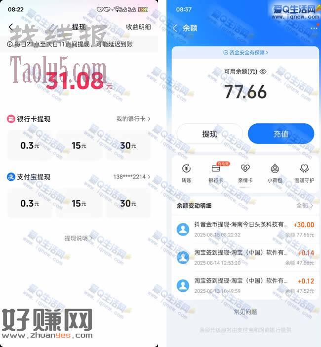 抖音APP-首页-左侧【红包】图标点进去-弹签到得金币 部分号连续签到有大额金币可提现到支付宝