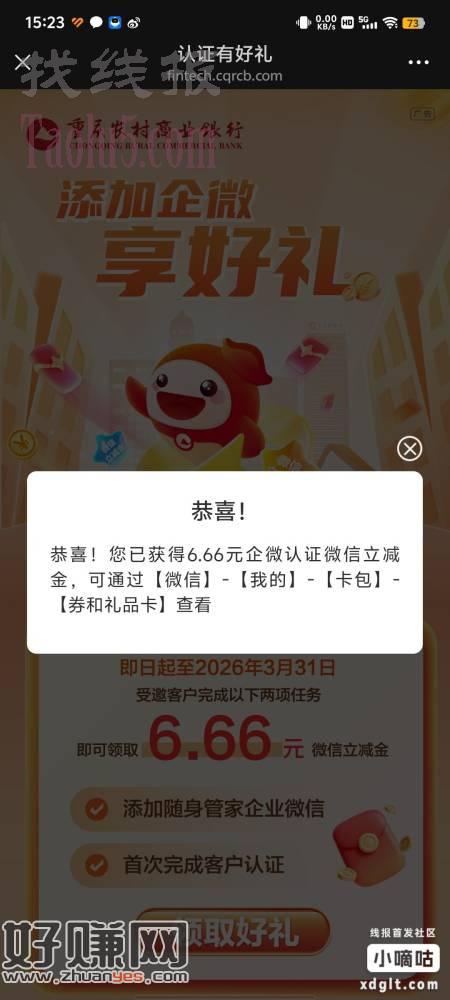 重庆农商行首页横幅添加企微领 6.66 立减金没领的可领