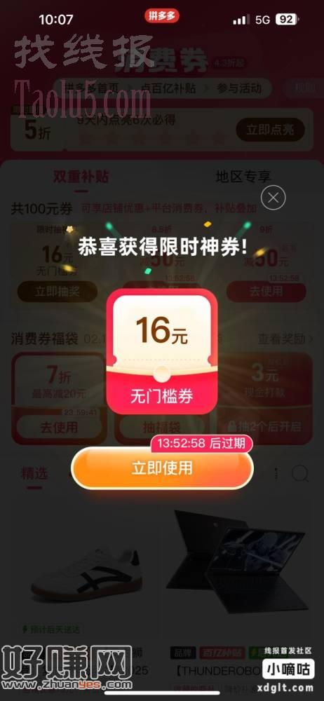 拼多多百亿补贴进去有个抽奖,可以得16元无门槛券,不必中