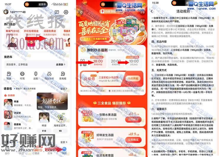 百度地图APP-我的-下拉至【热门活动】-【汤圆免费送】18点抢兔费汤圆 28号10点抢