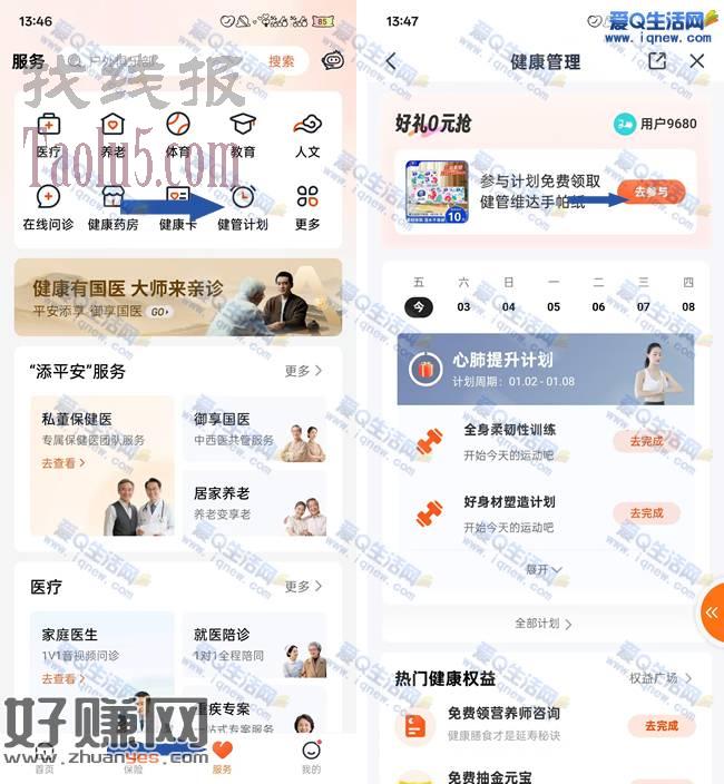 平安金管家APP-底部【服务】顶部-健康计划-好礼0元抢-连续打卡5天撸维达手帕纸