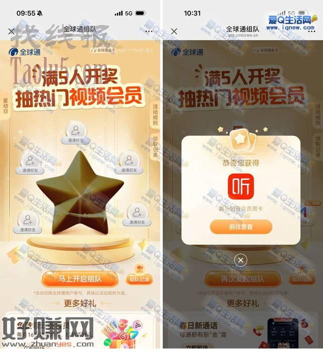 移动全球通组队抽视频会员 亲测喜马拉雅周卡