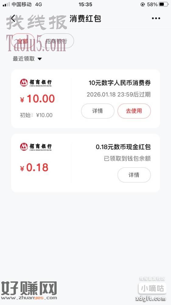 招行,数字RMB,Z.x重新开,领10数字,当天Z.x隔天再重新开,然后在数字RMBapp登陆随便消费一笔就到账了。