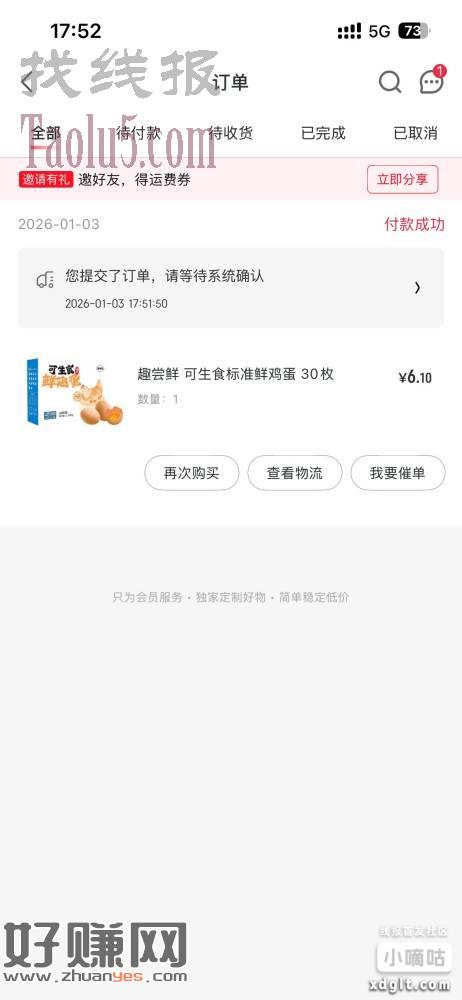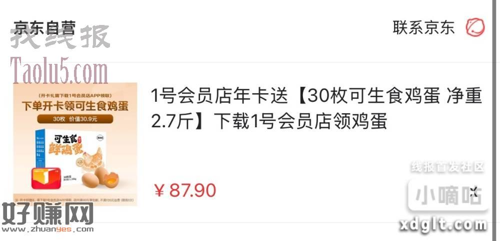 京东平台领开通1号会员店优惠券开卡,开卡成本用卷加超市卡最低0.01,然后下载1号会员店登陆下单,成本6-10可撸30个鸡蛋或者米油等
