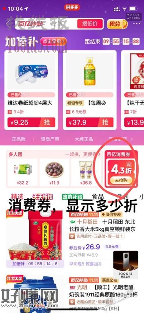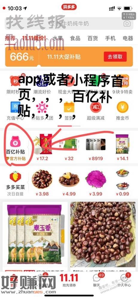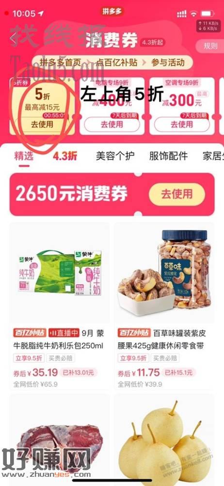 拼多多5折可以买苹果,黄瓜,脆柿子,可以搜贴看,路径是这个,我试了5个号,3个不显示,2个显示