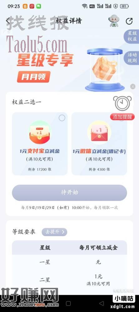 10点邮储APP权益中心领1元立减金,星级越高,领的立减金就越多