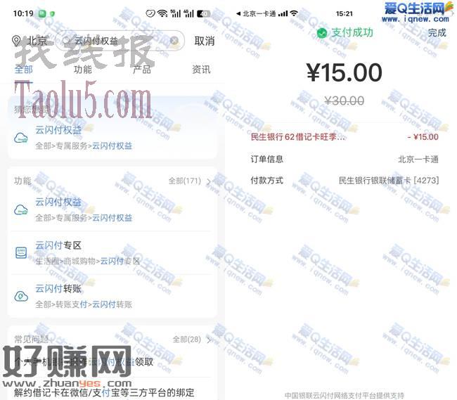 2.民生银行app-首页顶部搜【云闪付权益】-我的权益-旺季尊享15元礼,领30减15,可以充一卡通或还信用卡等