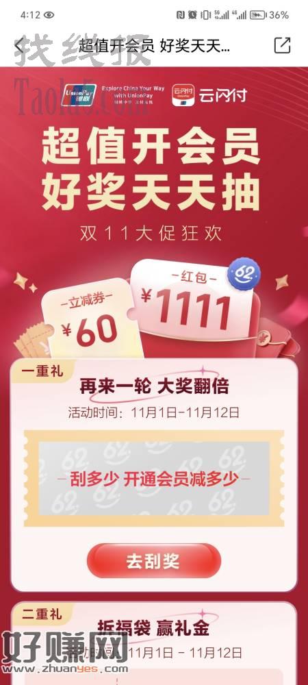 云闪付羊毛,首页横幅抽奖,大概率中20元券,开通腾讯联合月卡