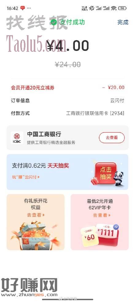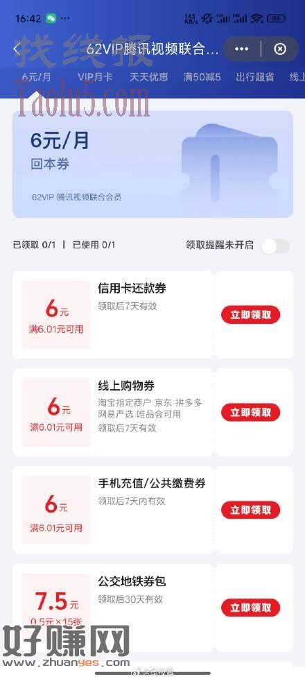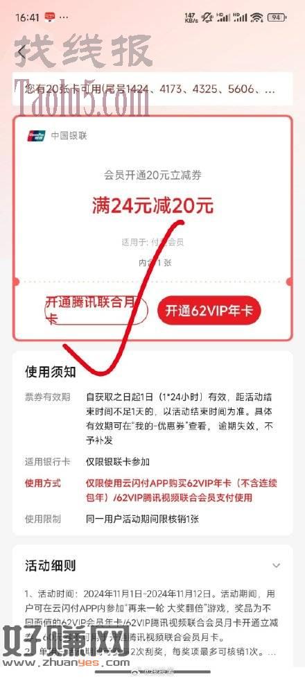 云闪付扫,抽20券,然后去卡包,点使用,开通云闪付腾讯联合月卡,付4元,再去会员中心,领取6信用卡还款券,会自动到账一个腾讯月卡
