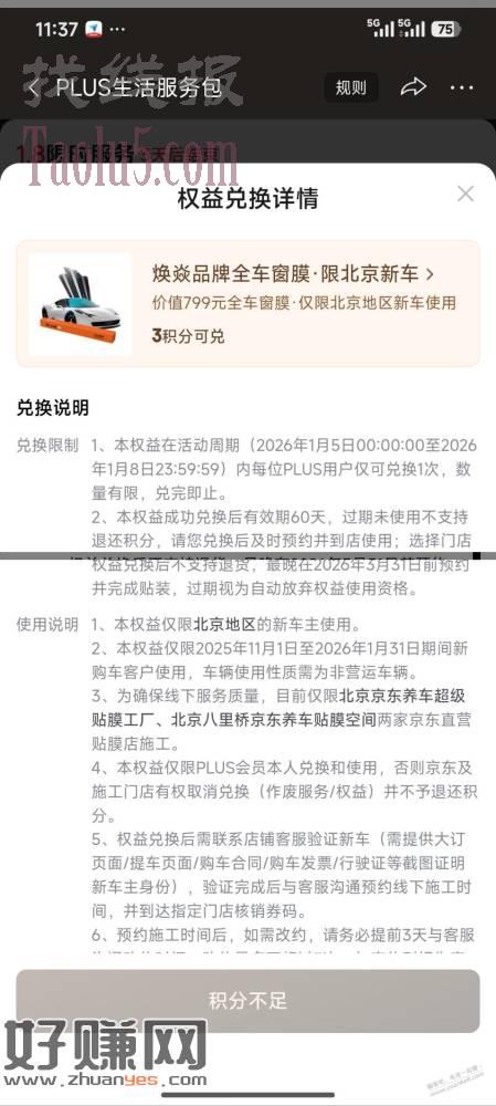 jd权益上新,北京新车3积分兑换贴膜服务,60天有效