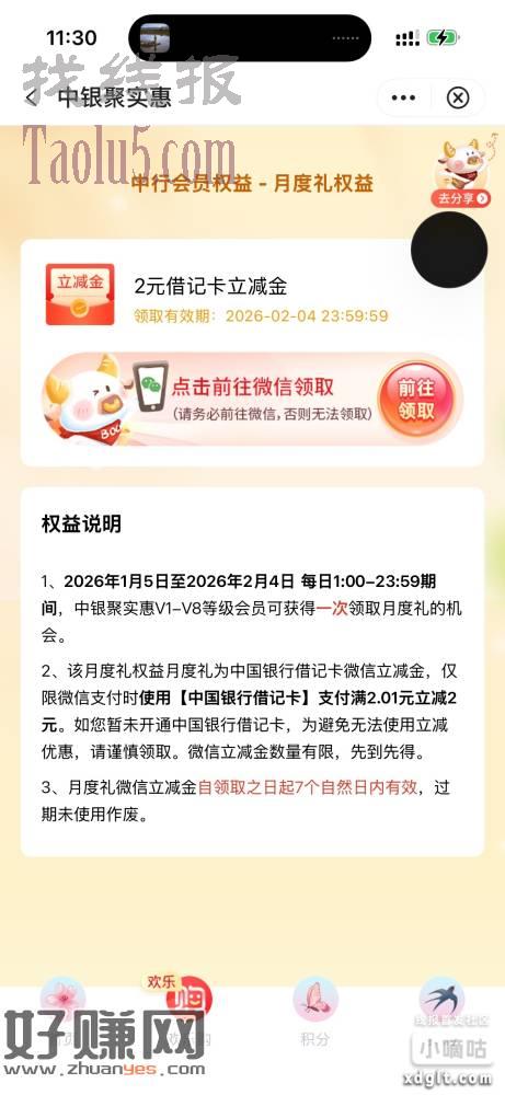 中行月度礼领1-30立减?