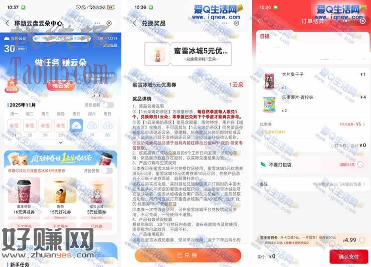 移动云盘1云朵 抢霸王茶姬/喜茶/蜜雪兔单券