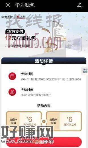 华为钱包充值交通卡,广发储蓄卡50-6,每天一次,活动期总共2次