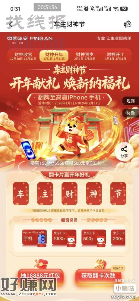 终于中了一个小奖不在是积分了,车主财神节活动,不用申请贷款浏览就有一次机会(平安口袋银行app)