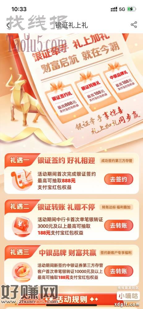 操作流程:在证券app里绑定中行卡为第三方存管账户,然后向里转3000,等几分钟后就可以在礼遇二里抽奖,奖励有名额再砸蛋,最低18,没有别砸。如果你是今年新绑定客户,第二天还可以到礼遇一抽奖,最低也是18。