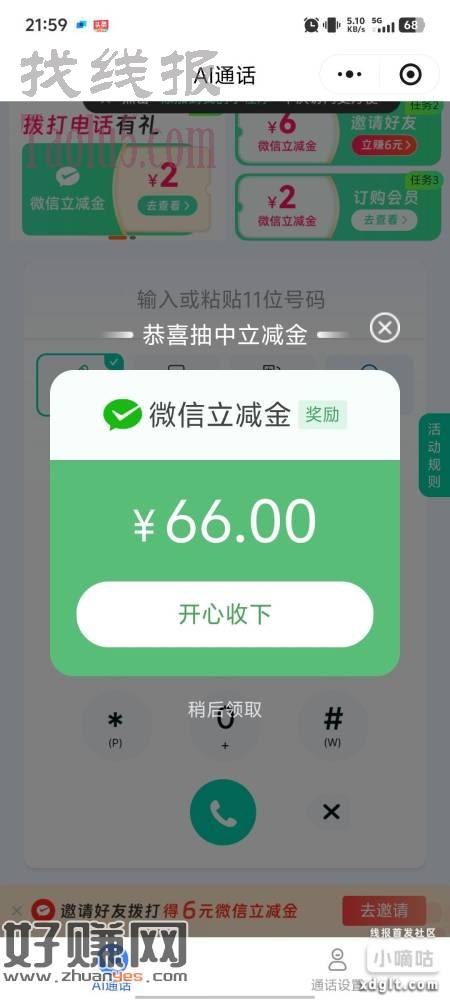 微信小程序搜索5g新通话,有个拨打有礼可以领2立减,然后有个关注公众号可以抽。本来任务平台刷到的,去做任务抽了个66立减