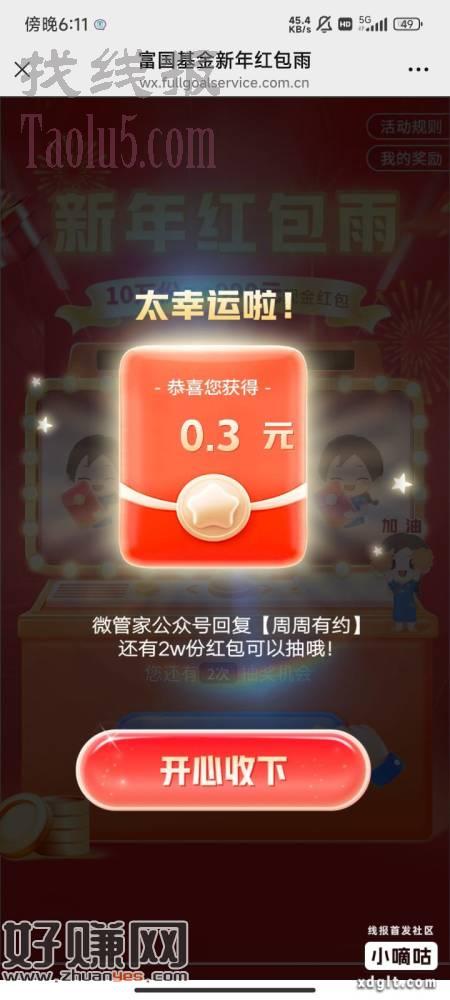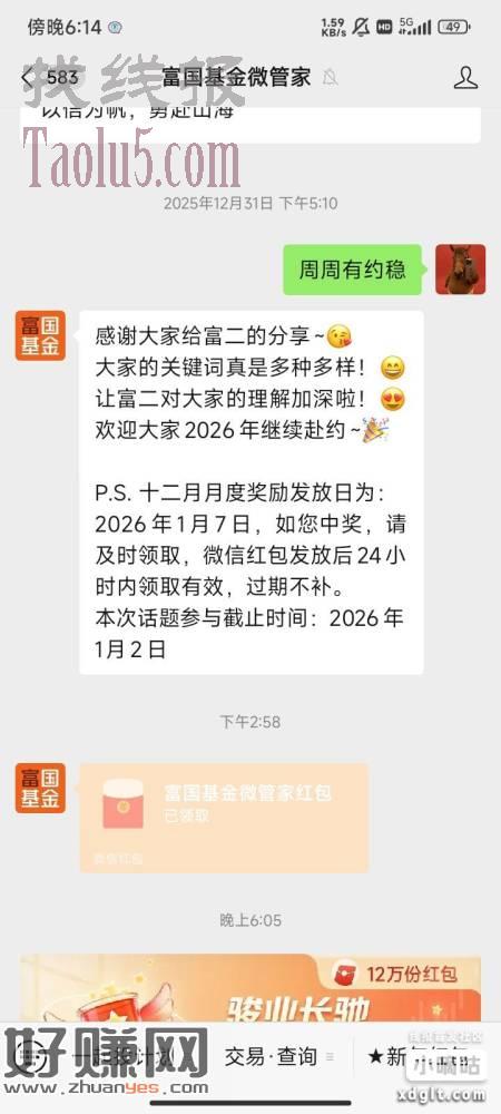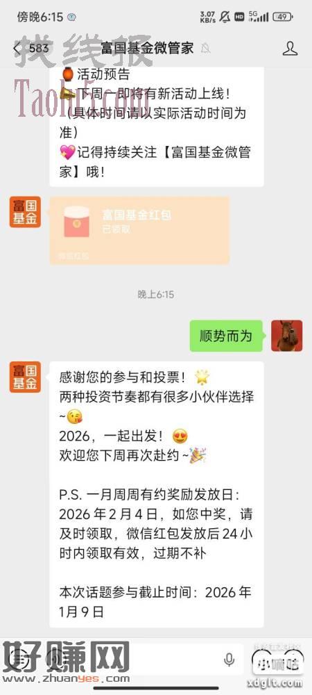 富国基金微管家,右下角新年红包,那个每周活动也可以参与一下,这期口令顺势而为。