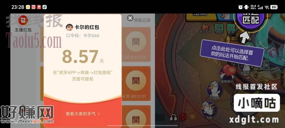 虎牙搜索卡尔 进入直播间 右边鹅鸭杀下载 记得选口令红包那个