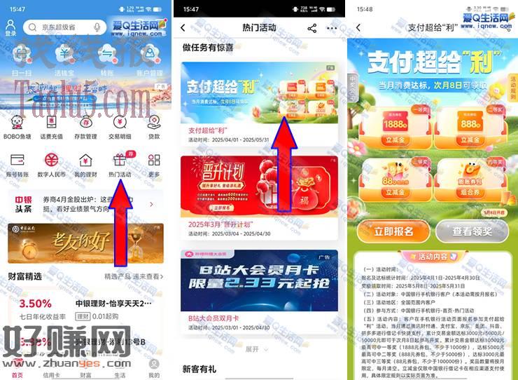中行APP-首页【热门活动】-【支付超给利】-立即报名-消费达标次月8日来领奖