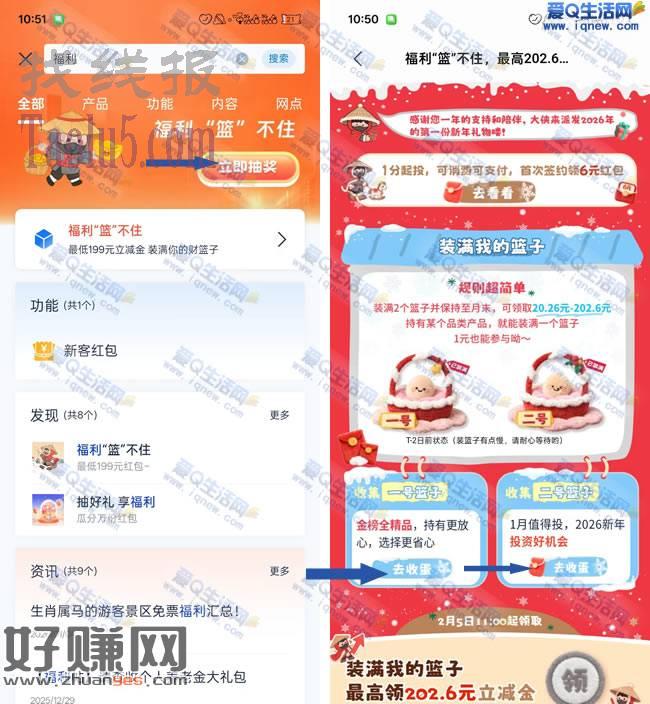 浦发APP-首页搜【福利蓝不住】下拉至【装满我的篮子】-一号篮子 二号篮子-去收蛋-页面上有很多基金-任意选择一个购买1元 基金-达标之后 2月5号11点开奖