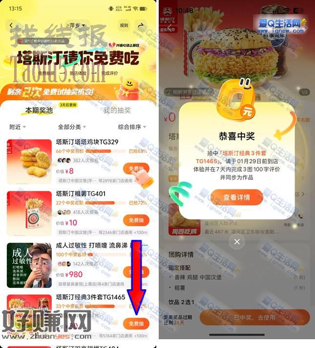 抖音免费试抽免单 反馈中塔斯汀3件套