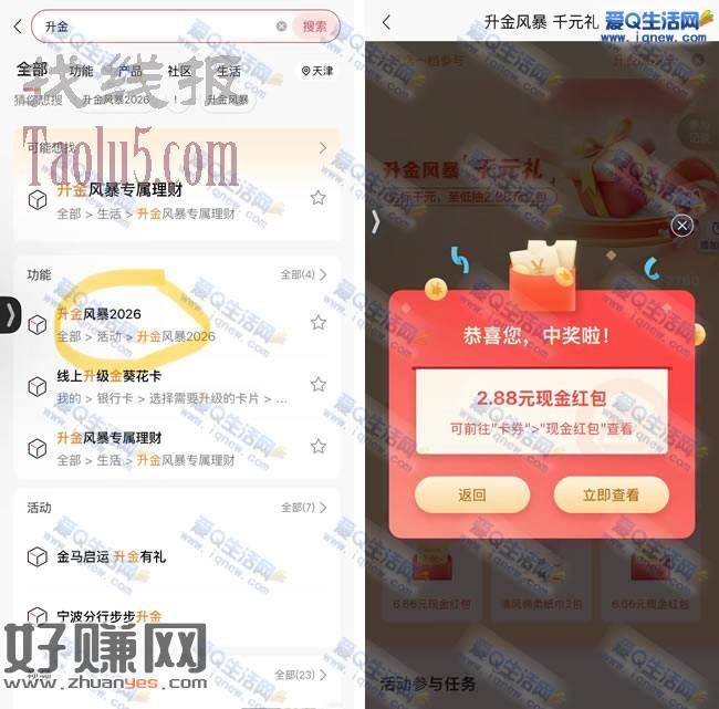 招行APP顶部搜【升金风暴】升金风暴2026-点进去-完成任务转入1000元 第二天搜索入口去抽奖试试