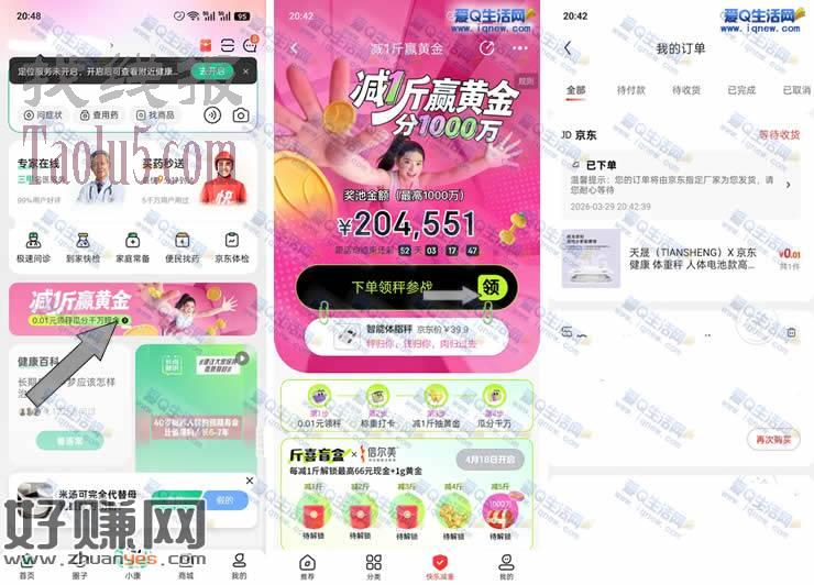 1.京东健康app-首页中间滚动横幅【减1斤赢黄金 0.01元领秤瓜分千万现金】点进去 邀请3个好友助力可以0.01元下单体脂秤