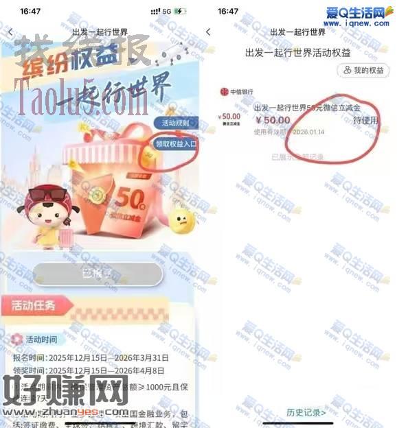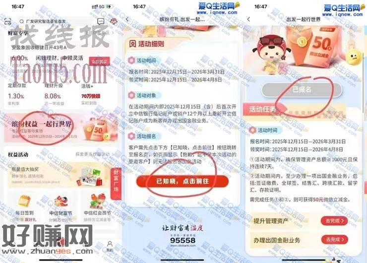 中信银行APP-首页中间滚动横幅【缤纷权益 一起行世界】点进去-受邀用户参与-点击【已知晓点击前往】-去报名-完成任务 领取权益