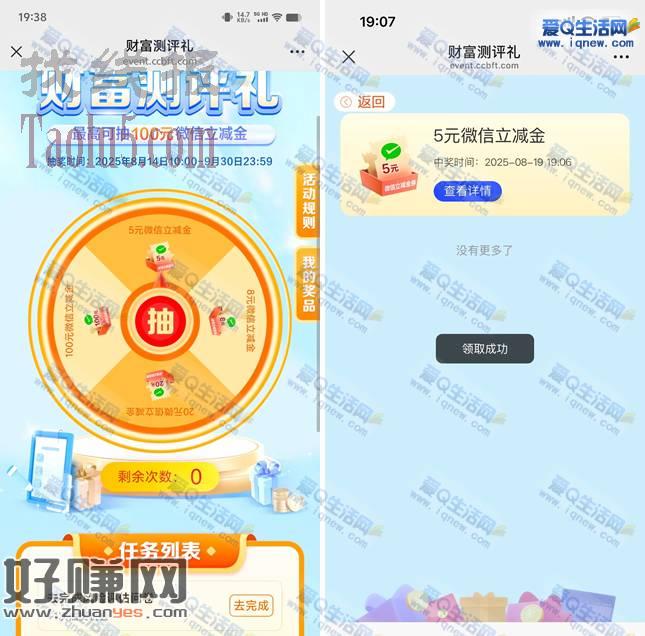 建行财富测评礼必中5-100元立减金 亲测5元秒到