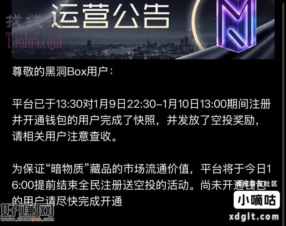 黑洞box新人,汇付2没拉新需要自己格局,16点之前注册开钱包给一个空投(暗物质),转售已经开了,10-15,这个自辨哦,还有不到几分钟了,我早上的开了已经到了