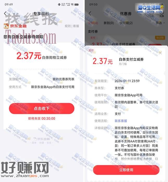 京东金融领2.37元白条支付立减券 当日有效