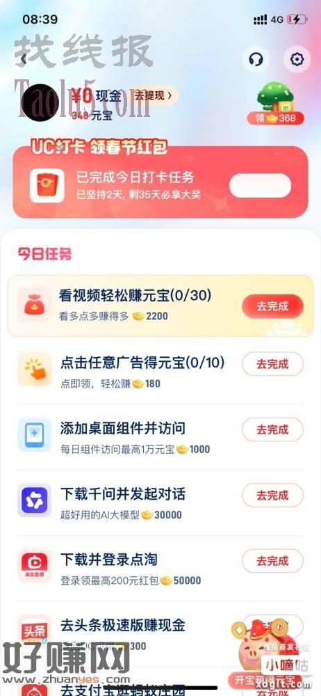 UC浏览器,我的,福利猪领元宝,上面横幅UC打卡领春节红包