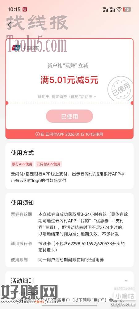 云闪付领5回归礼,可以交电费,无头