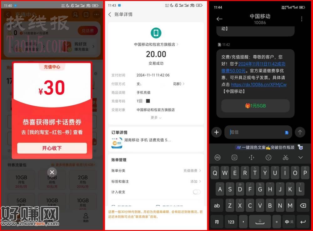 然后淘宝app点充值中心,自动弹30话费券,0充30话费或者20充50话费