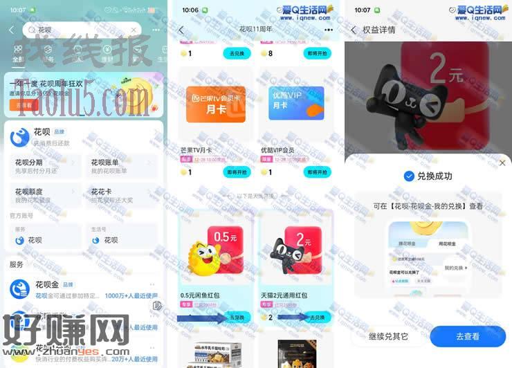 2.花呗金下拉可以兑换2元天猫无门槛红包 0.5元闲鱼红包 还可以抢兑实物