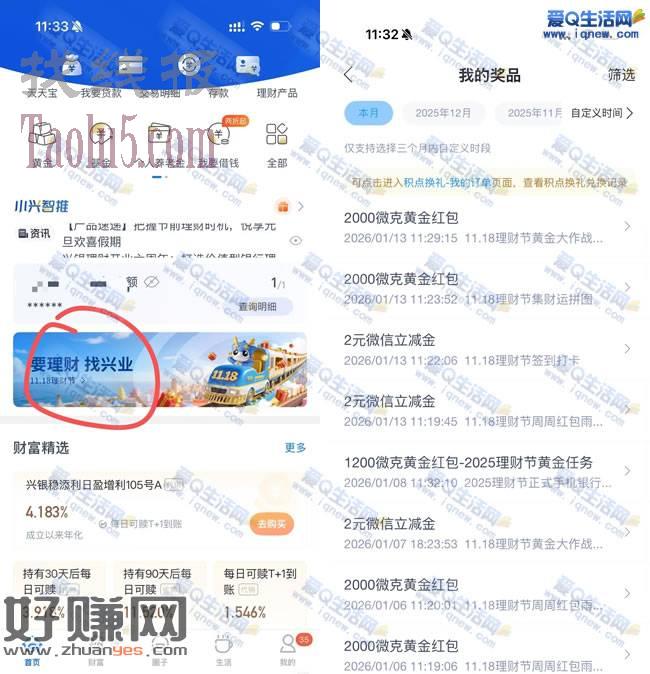 兴业银行APP-首页-下拉至【要理财 找兴业】点进去 完成所有活动 获得黄金红包 现金红包 合计8元左右