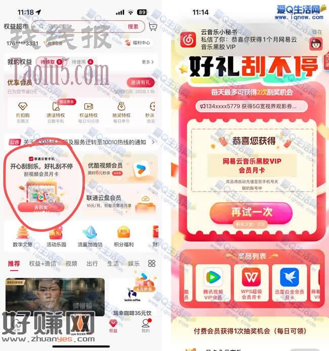 联通APP搜【权益超市】顶部左侧滚动窗口【开心刮刮乐 好礼刮不停】点进去下拉完成任务抽奖试试