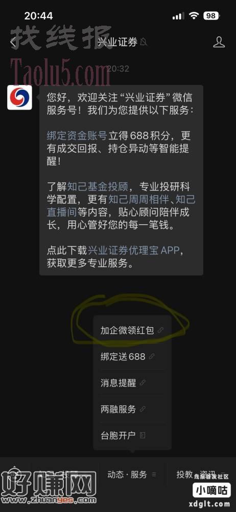 第二步去兴业证券服务号点菜单栏中间第一个领红包 秒推