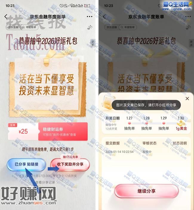 京东金融APP搜【年度账单】-去查看账单-到最后【收下奖励 并分享】会自动跳转到小红书 会自动编辑好图文 发布之后 复制链接 去粘贴好链接 即可等待开奖