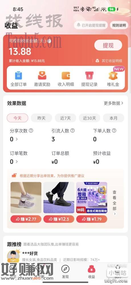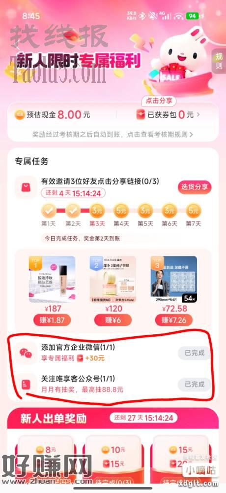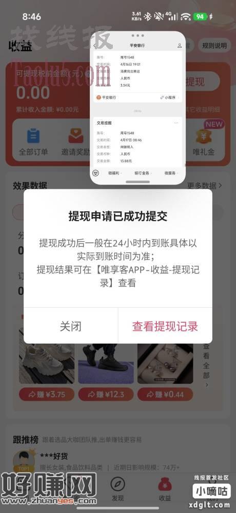 感谢还木大佬分享的唯享客,中间添加公众号也可以做一下,我抽到了8.8,加上第一天的5,提现是秒到。