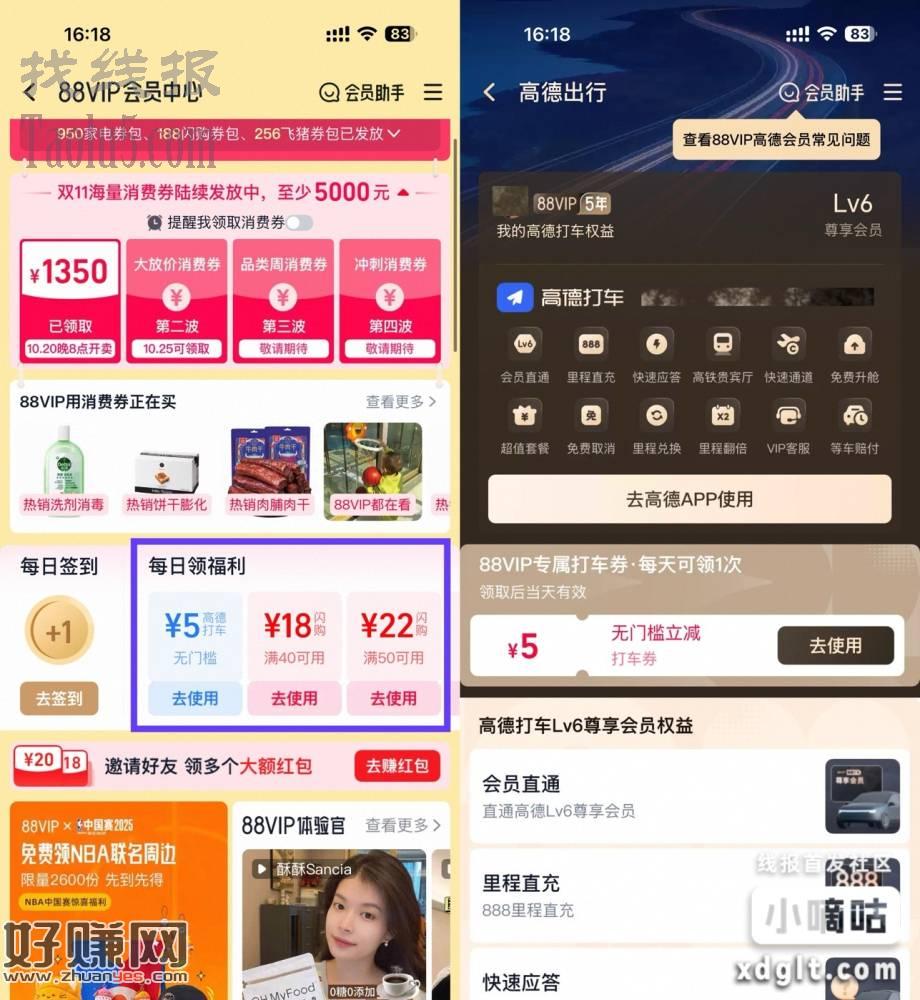 淘宝搜索“88VIP”每天可领5亓无门槛高德打车券