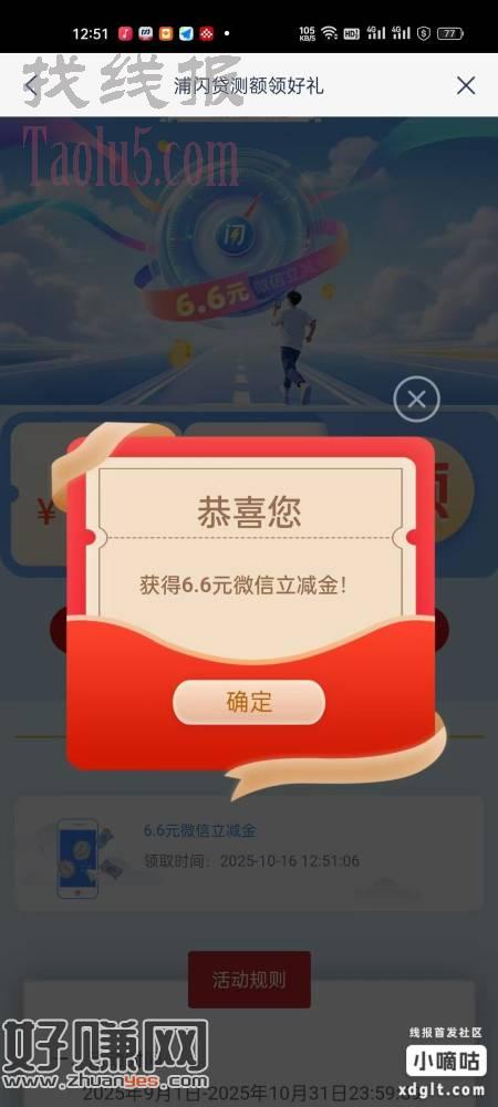浦发银行热门活动里面测额有礼 不管成不成功都是6.6