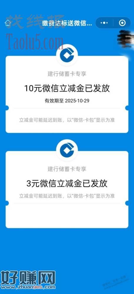 建行APP搜数币缴费,缴50水电费或者电话费,目前极大概率中10元微信立减金,另外3元是叠加送的