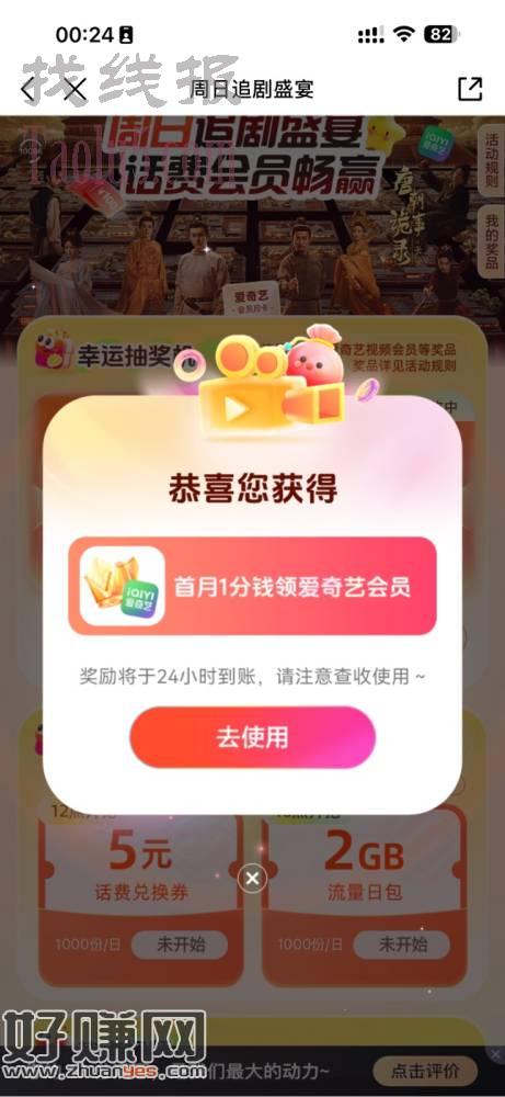 抽中一分爱奇艺,实际到账8话费